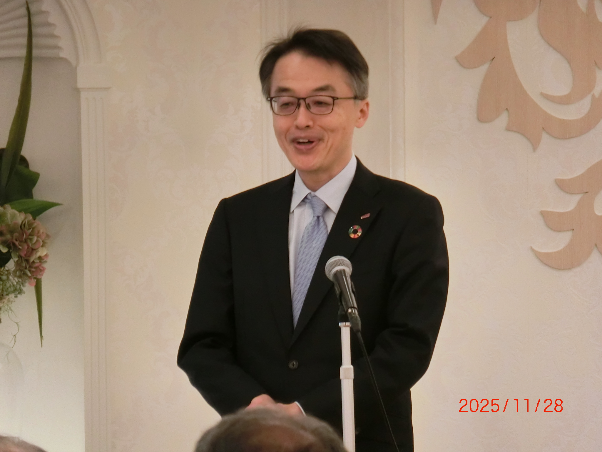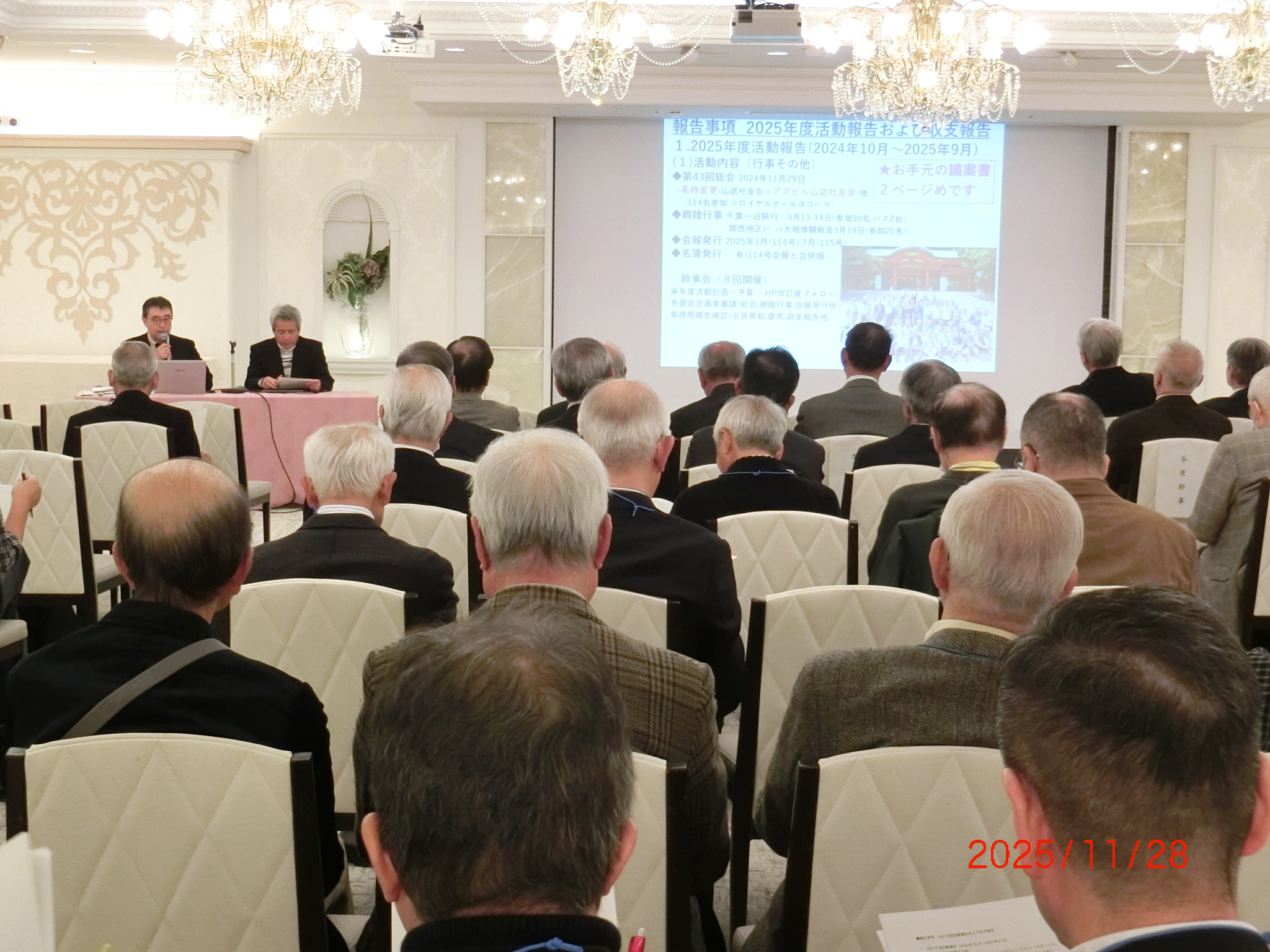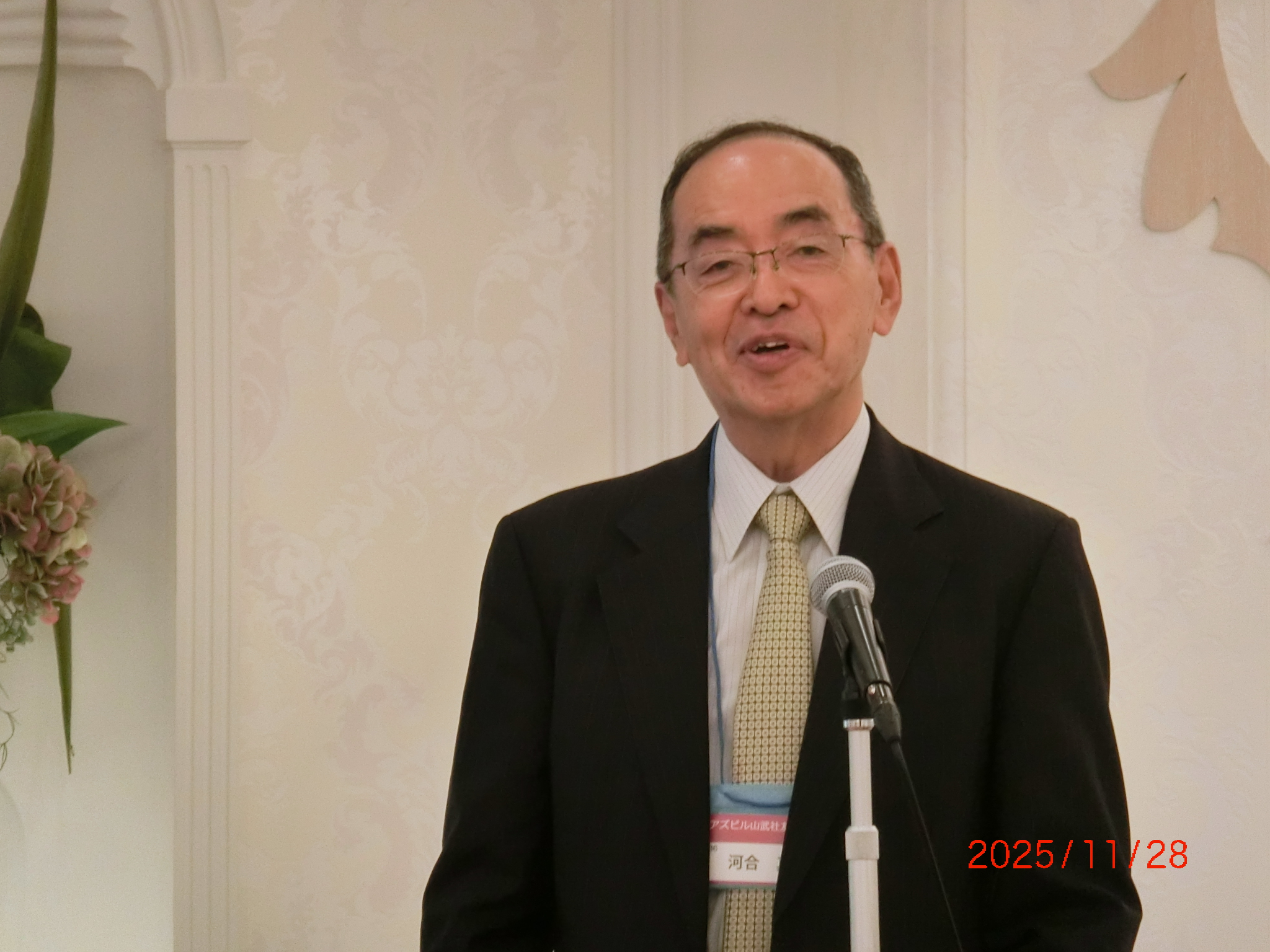 第44回アズビル山武社友会総会が開催されました お知らせ 2025.12.18 2025年11月28日(金)にロイヤルホールヨコハマにて94名の会員様ご出席され総会が開催されました。 今回の幹事改選期において、齊藤清文会長がご退任され、新たな会長に河合真さんがご就任されました。なお、総会の詳細につきましては、2026年1月発行の会報をご覧ください。 河合会長(新任ご挨拶) 山本社長(ご挨拶) 総会 アズビルから社友会へ寄付目録贈呈 懇親会