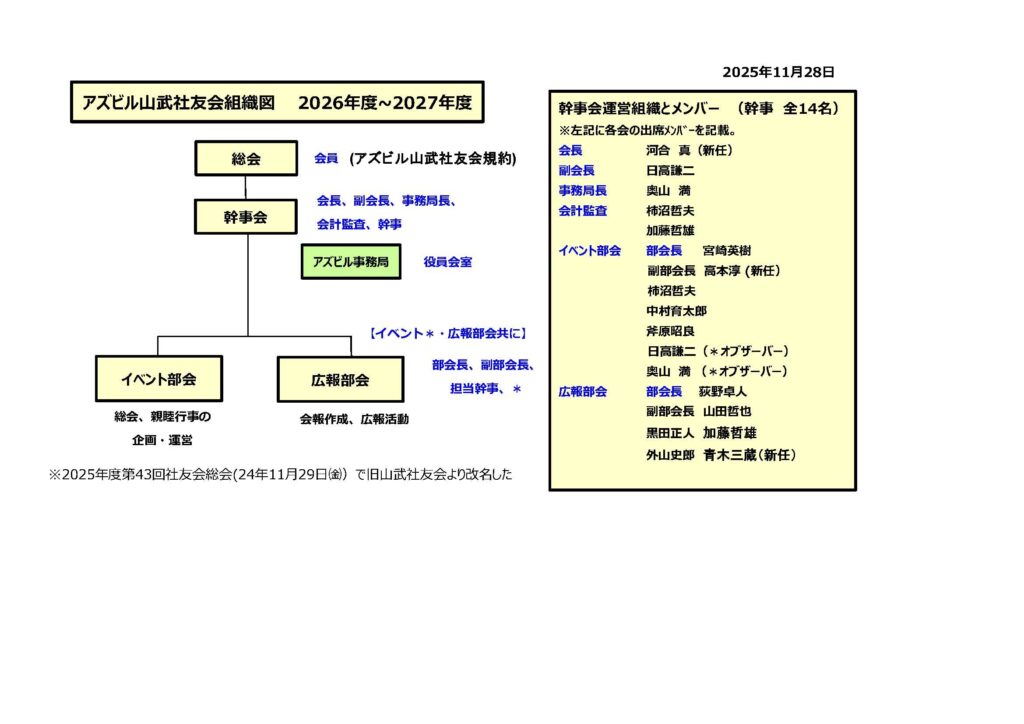 アズビル株式会社(旧 株式会社 山武)出身者のOB・OG会です。活動目的は、会員相互の親睦と社会・会社への貢献です。